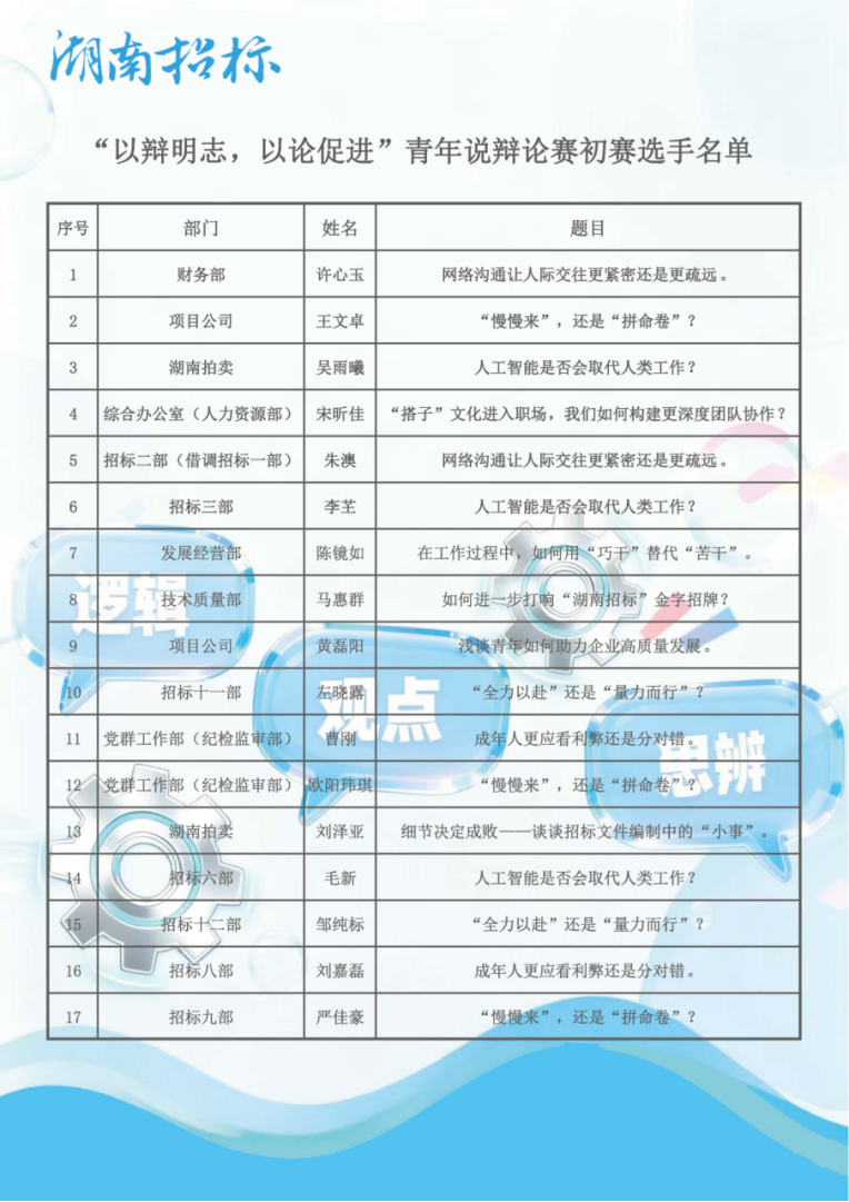 初赛余音未绝,决赛烽火再燃!决赛将展开正式辩论赛,延续“以辩明志、以论促进”的核心宗旨,为湖南招标青年搭建展现自我、交流思想、共同成长的平台,汇聚起推动公司奋进“十五五”的青春动能!